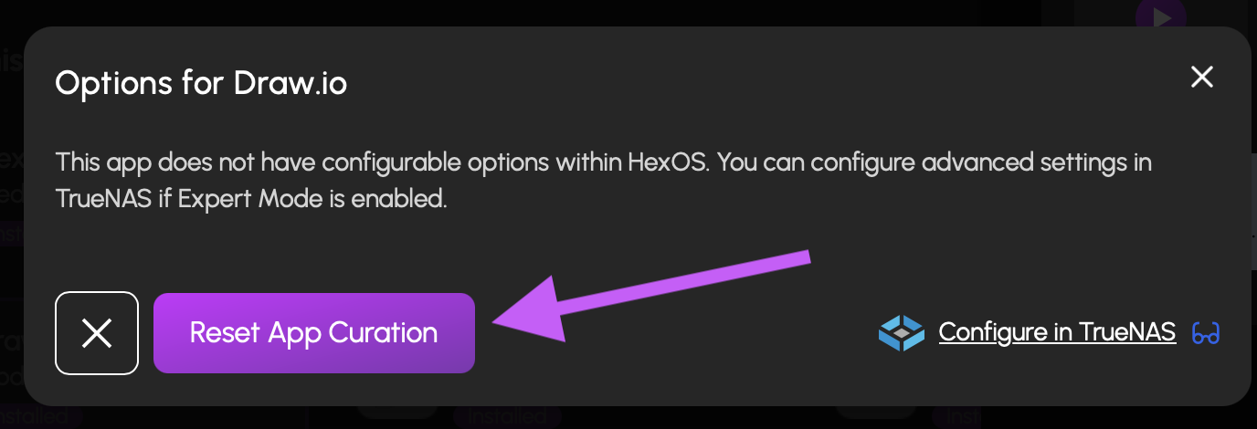 If the settings on an app were changed in TrueNAS you can use Reset App Curation to bring it back to the HexOS default configuration.